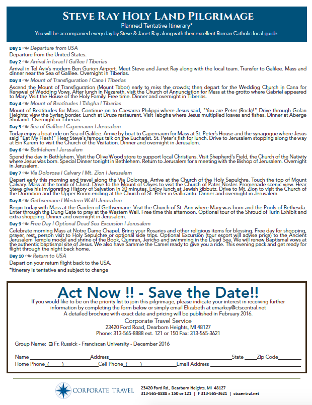 Here is the cover of the brochure for the Family Holy Land Pilgrimage — the one that my grandkids are going to and Terry Barber with his family as well.